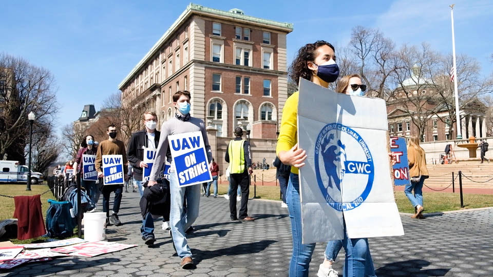 Here in New York, over 3,000 research and teaching assistants at Columbia University are on day 10 of their strike demanding fair wages, improvements to healthcare and child care provisions. Workers are also asking for third-party arbitration in cases of harassment and discrimination. Democracy Now! spoke to some of the strikers.