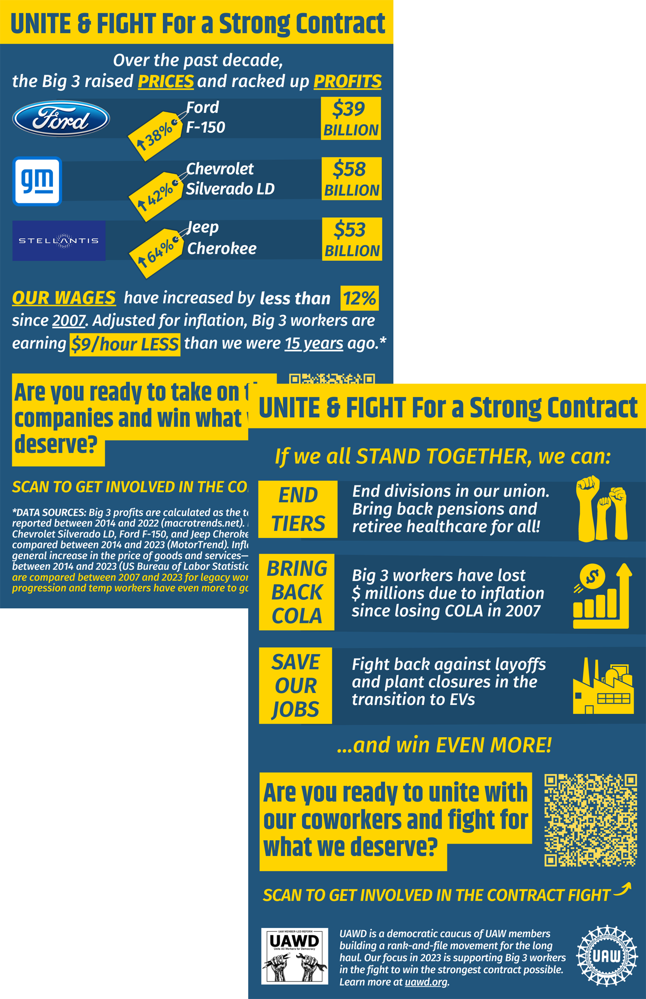 UAWD is connecting members across the UAW with resources and member-to-member support. We encourage members to take the lead in building up energy around a contract fight, which we hope will strengthen preparations for a strike that UAW locals might have in the works and also bolster the International contract campaign as it develops. When we stand united with our coworkers and prepare for a fight against the companies, our negotiators have more power at the table.