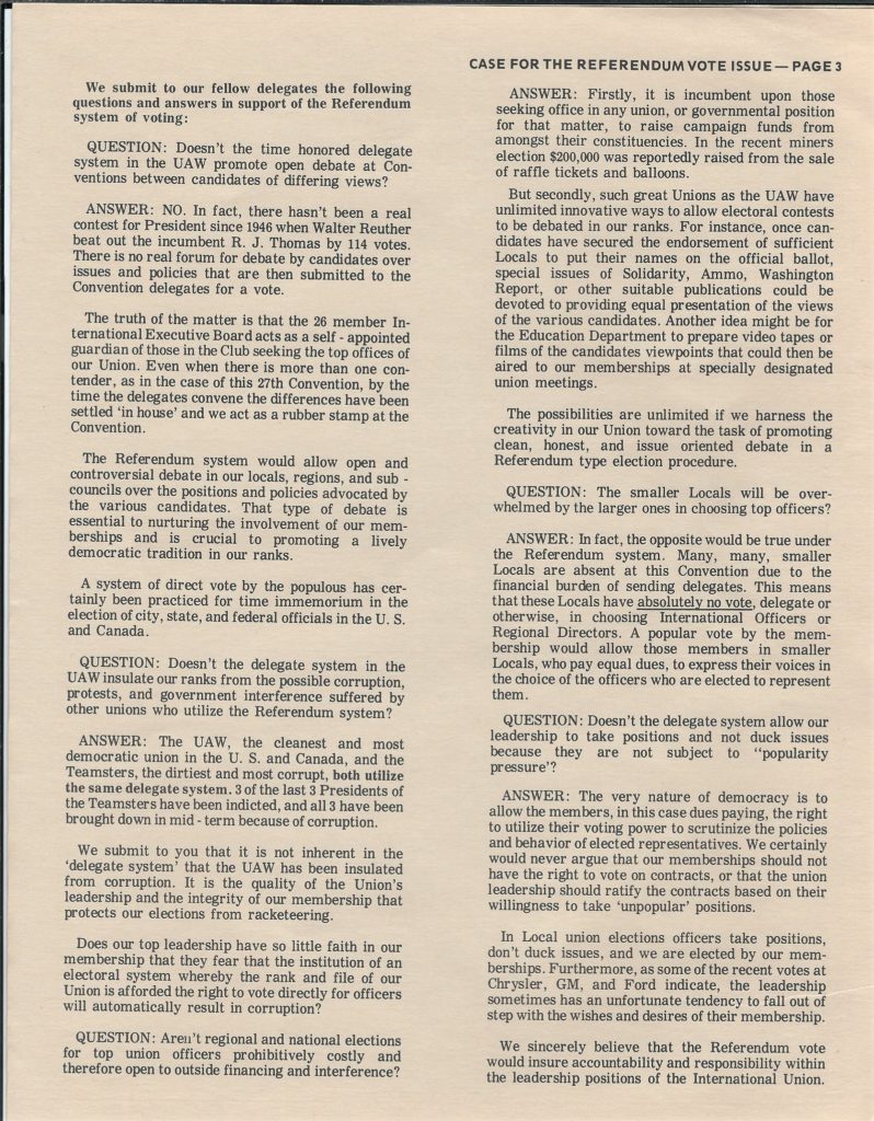 “In fact, the opposite would be true under the Referendum (OMOV) system. Many, many smaller Locals are absent at this Convention (1983) due to the financial burden of sending delegates. This means that the Locals have absolutely no vote, delegate or otherwise, in choosing International Officers or Regional Directors. A popular vote by the membership would allow those members in smaller Locals, who pay equal dues, to express their voices in the choice of the officers who are elected to represent them.”